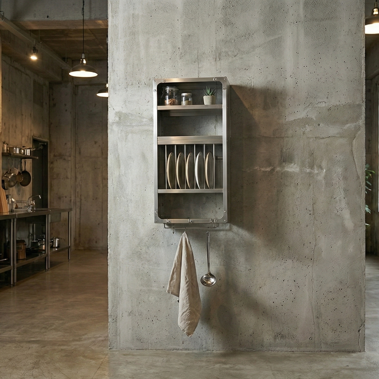 このシルバーの輝きは、ステンレスヘアライン加工によるもの。サビや腐食に強く、ハードな使用が予想されるキッチンの現場において、これほど信頼できる素材はありません。モルタル床や剥き出しの配管がある空間に、完璧に視察します。